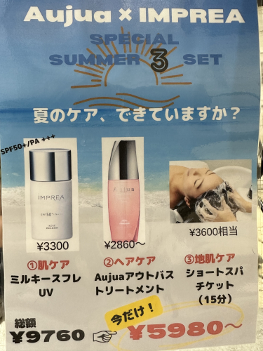 オージュアのセラムとミルボンとKOSEが共同開発した化粧品ブランド、インプレアからでている使い心地抜群なサラサラ質感の日焼け止めとショートスパチケットがぜーんぶ一緒になったお得なセットです!